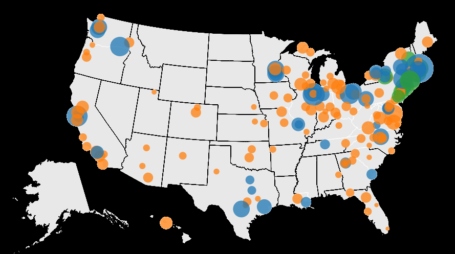 Learner's similar to one another according to various data, like areas of study and geographic location are linked together. Learner nodes are sized based on how close to completion they are, and colored by Areas of Study.